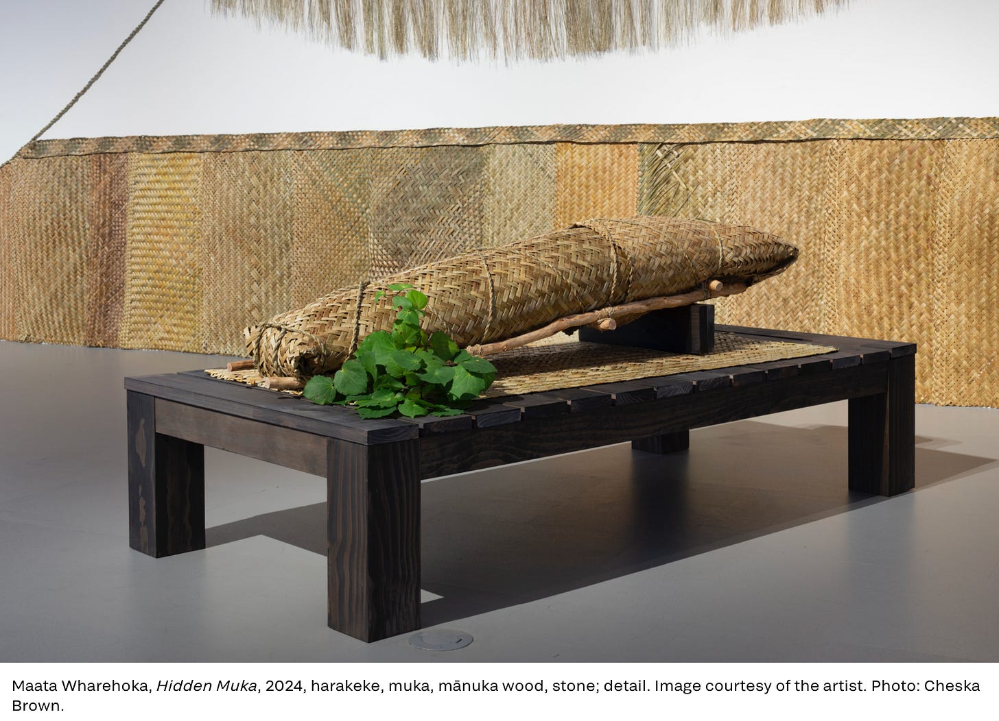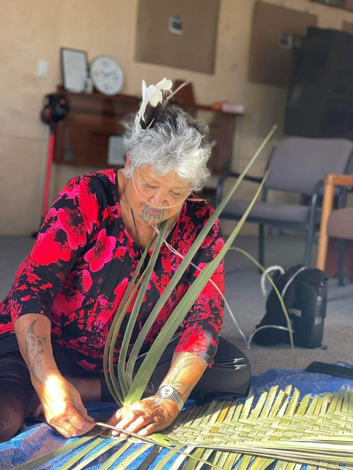 Last year, when I was at Parihaka to interview Maata, her family, and her community, Maata’s health was failing dramatically. Nevertheless, she actively engaged every day in finalizing a major exhibit of her weaving called Fibrous Soul. She had a grand vision for this exhibit, and she was determined to fulfill every detail. Weavers came from all around to help once they heard that she was unwell and struggling to complete the details of her designs. Maata even recruited me to help, despite my lack of experience, and taught me the rituals and perspective of this sacred art. The exhibit manifested her evolution and deep understanding of the practice of Kahu Whakatere, the ceremonial process for death and dying.